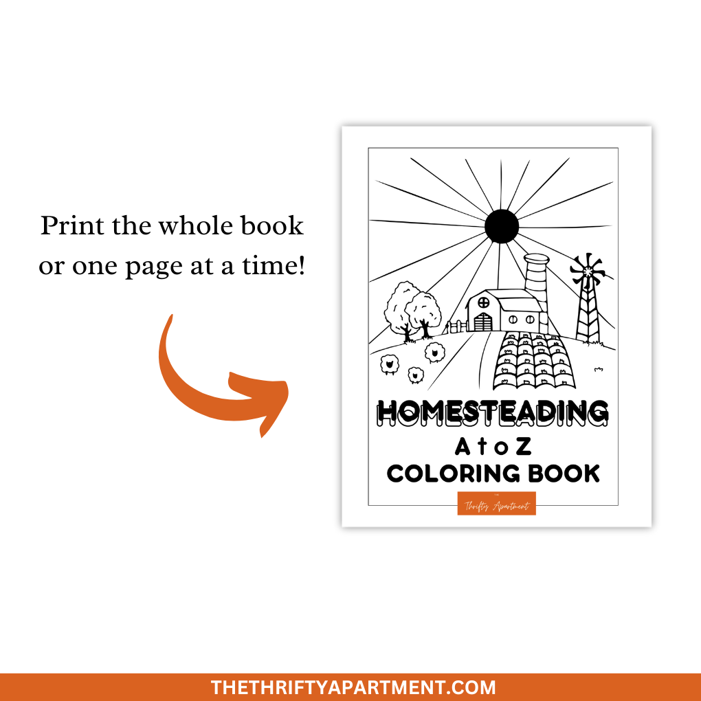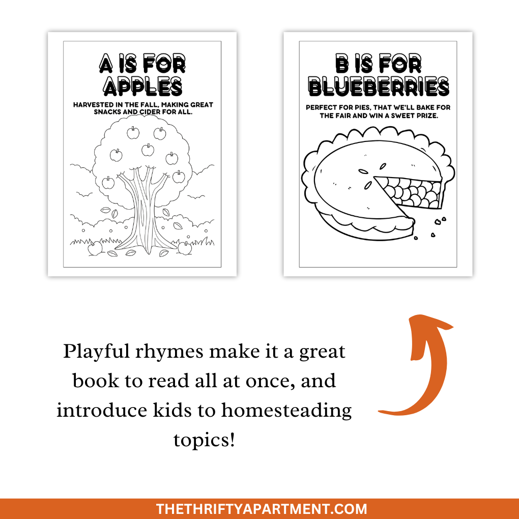 This cute coloring book helps kids learn about homesteading and farming topics like animals, plants, and self-reliance strategies. Each page includes a fun image to color and a rhyming description of that topic – from Apples to Zucchini and everything in between!